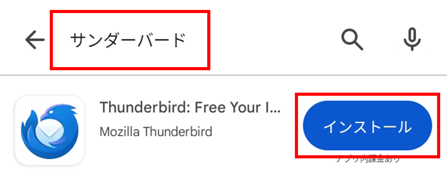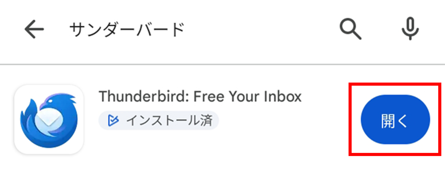 Playストアで「サンダーバード」と検索し、【Thunderbird:Free Your Inbox】をインストールします。