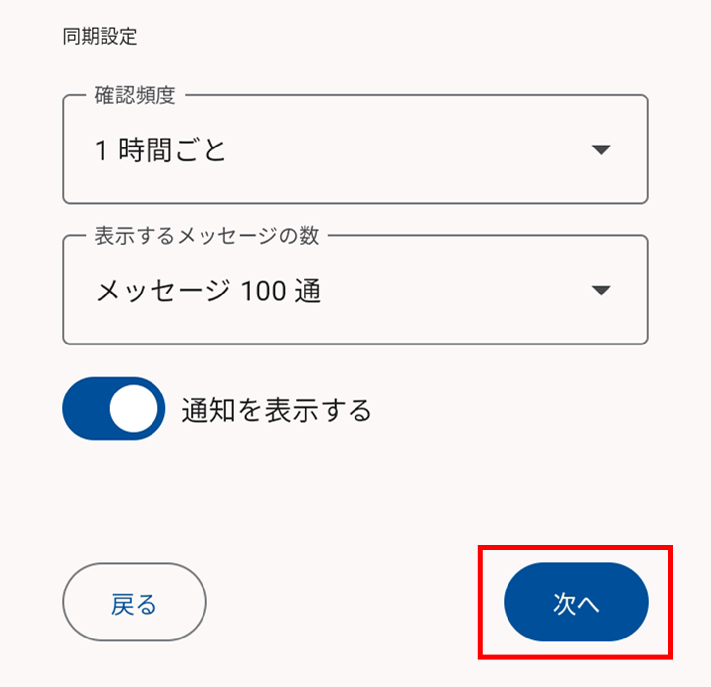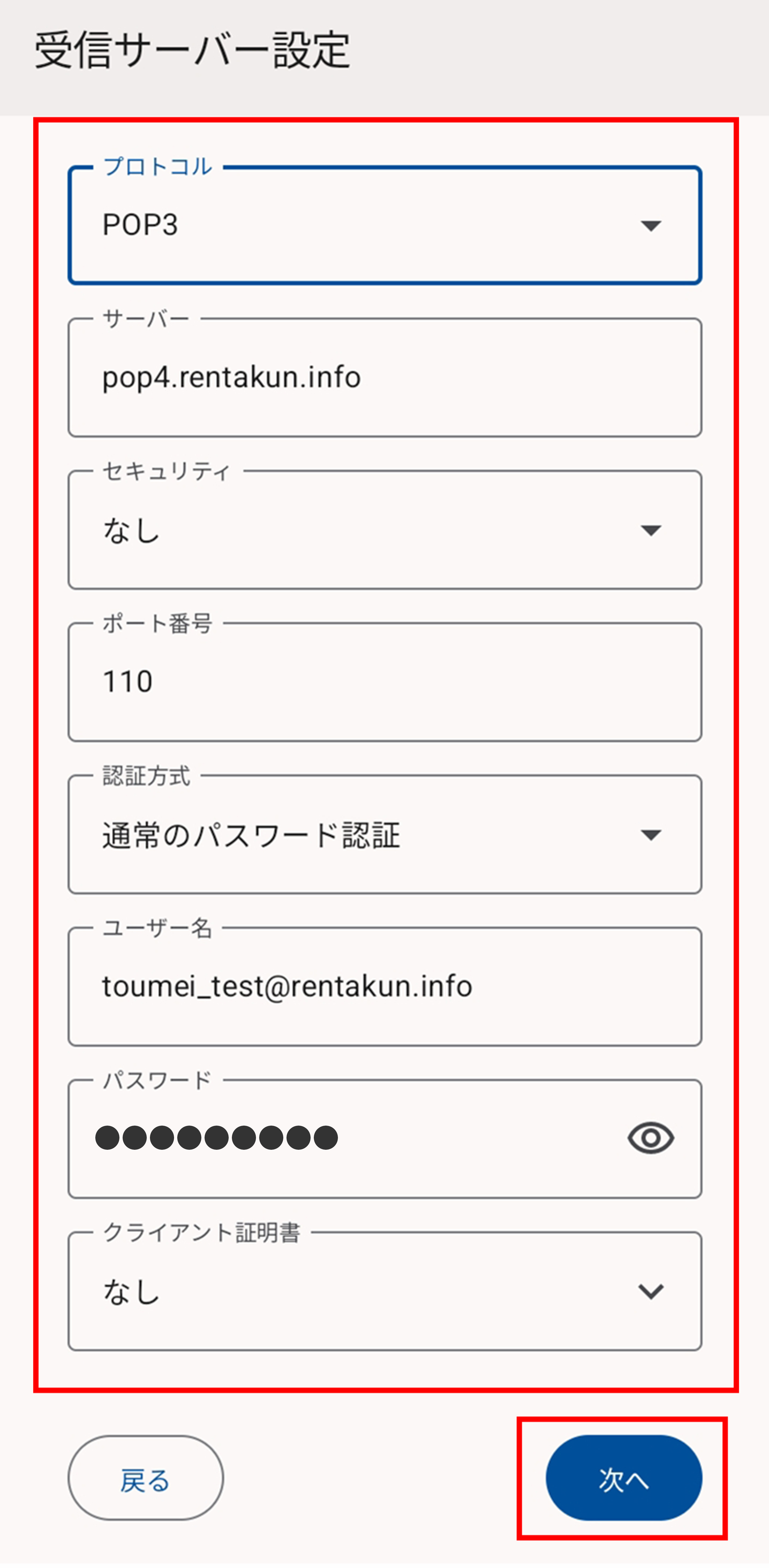 受信サーバーをアカウント通知書の通りに設定し、【次へ】をタップします。