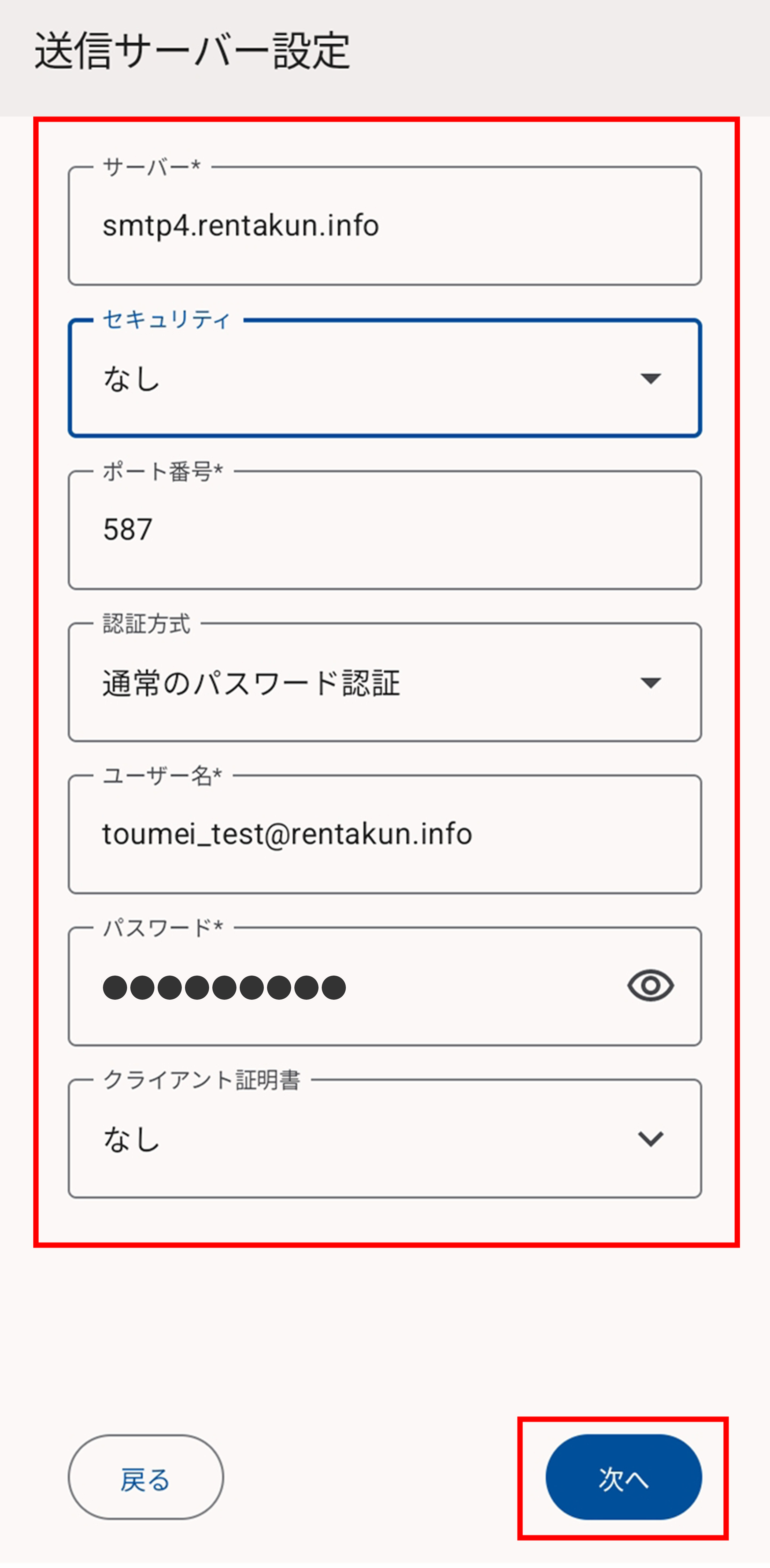 送信サーバーをアカウント通知書の通りに設定し、【次へ】をタップします。