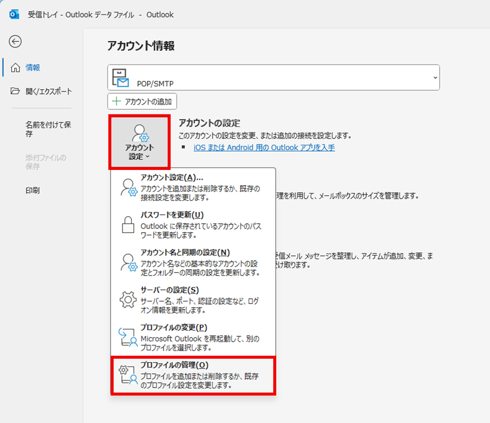 【アカウント設定】→【プロファイルの管理】の順にクリックします。
