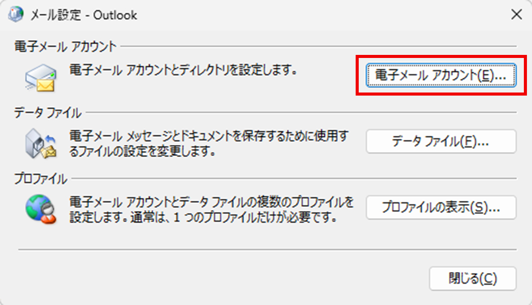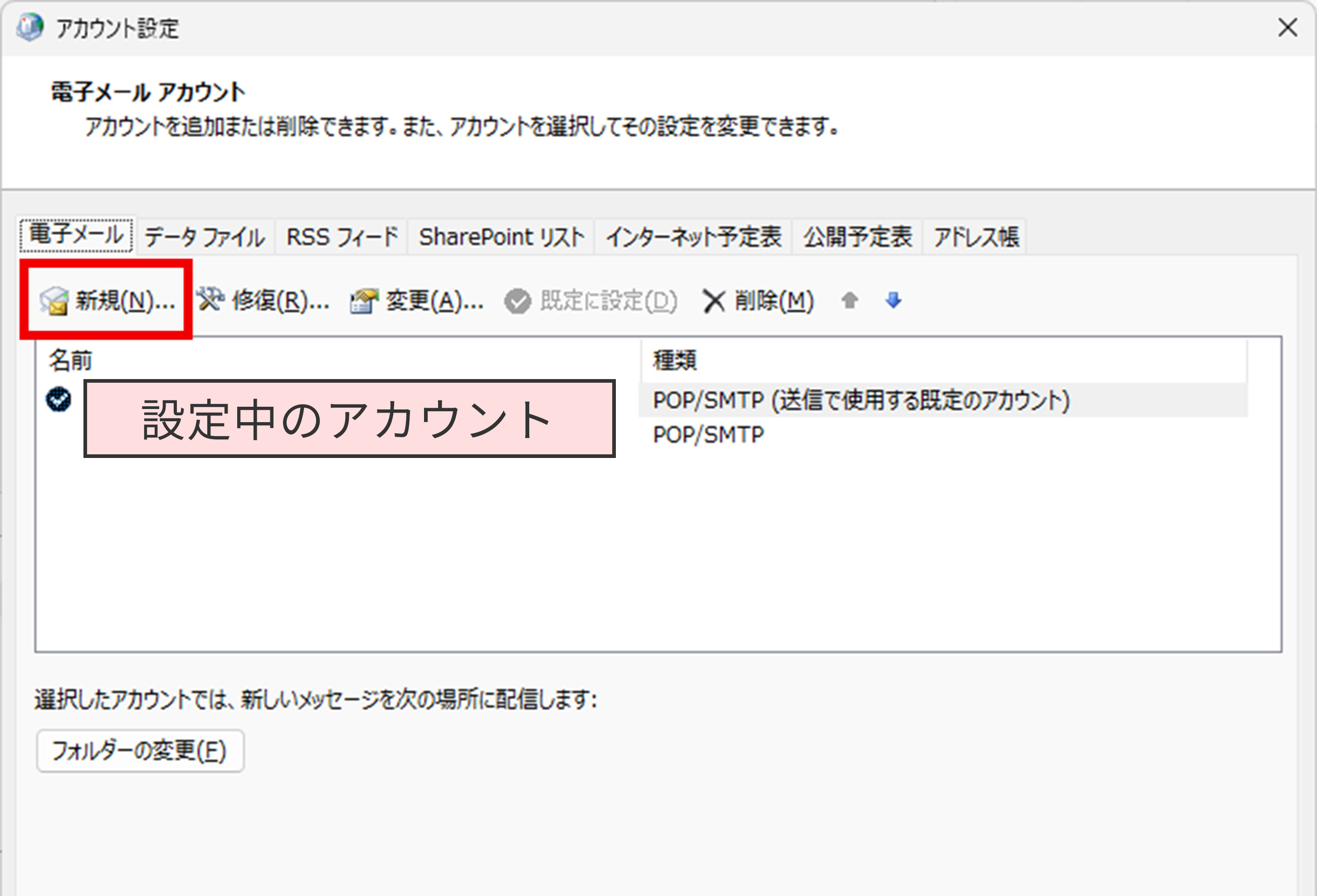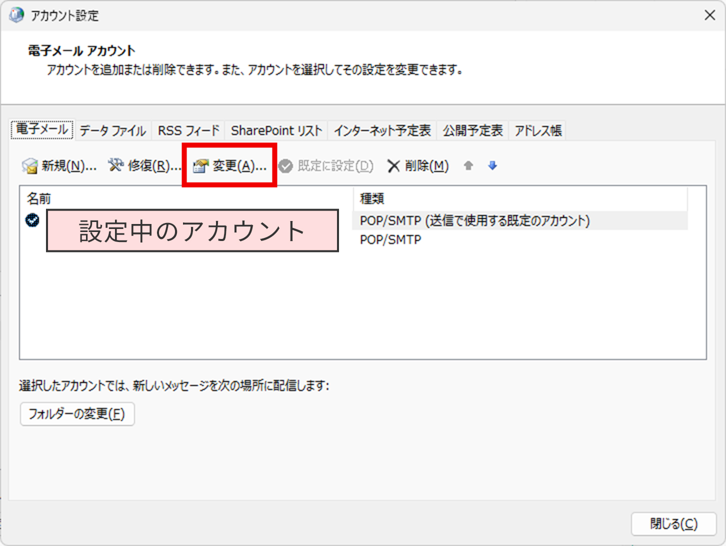 設定中のアカウントを選択し、【変更】もしくは、設定中のアカウントをダブルクリックします。