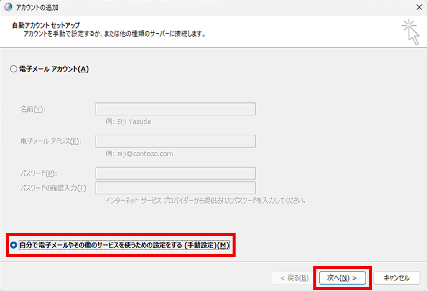 【自分で電子メールやその他のサービスを使うための設定をする(手動設定)】を選択し、【次へ】をクリックします。