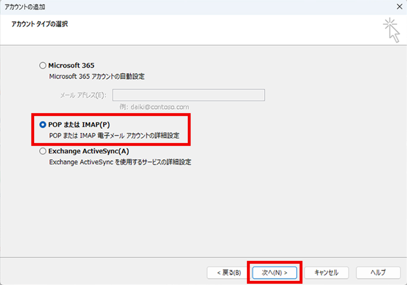 【POPまたはIMAP】を選択し、【次へ】をクリックします。