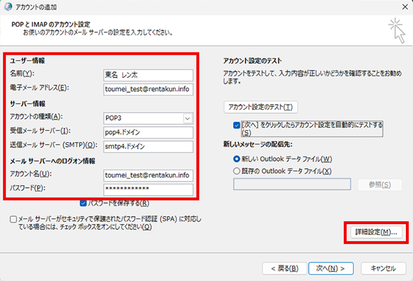 「受信メールサーバー」が、アカウント通知書の「POP3サーバ」