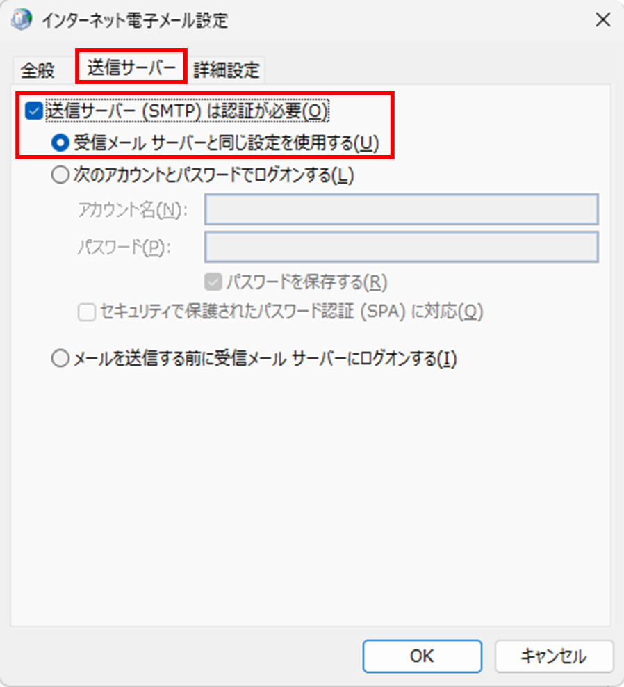 【送信サーバー】のタブの【送信サーバー(SMTP)は認証が必要】と、【受信メールサーバーと同じ設定を使用する】を選択します。