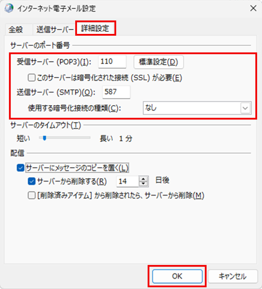 【詳細設定】のタブの【受信サーバー(POP3)】の数値を「110」