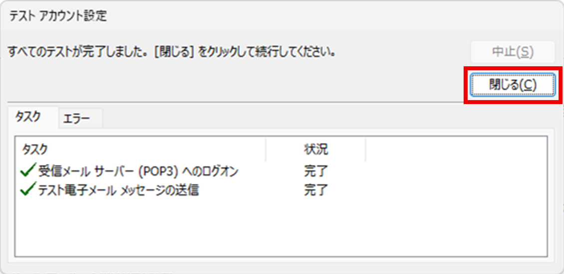 【「すべてのテストが完了しました。[閉じる]をクリックして続行してください。」と表示されるので、【閉じる】をクリックします。