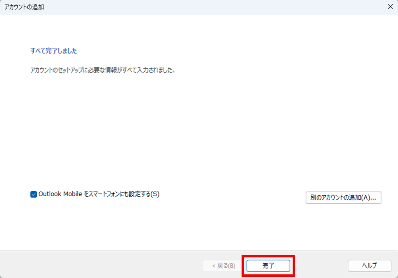 「すべて完了しました」と表示されるので、【完了】のボタンを押して、メール設定は終了です。